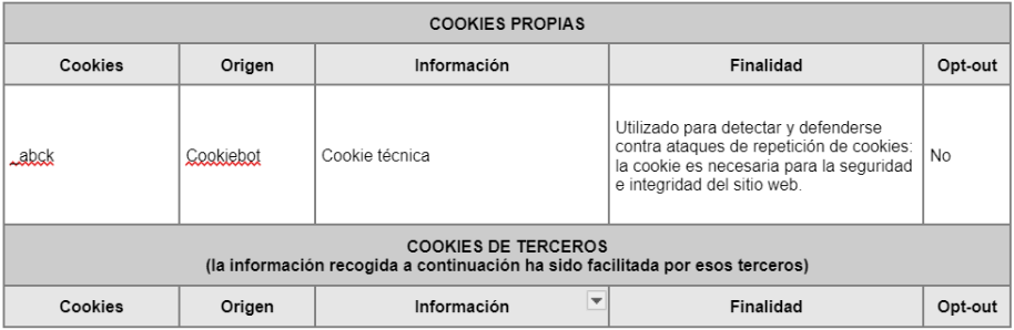 A continuación, se presenta un listado que clasifica las cookies utilizadas en Vidente, detallando su tipo, origen y finalidad. Asimismo, se proporciona un enlace para que el usuario pueda acceder a las Políticas de Cookies de los diferentes sitios web de origen.
