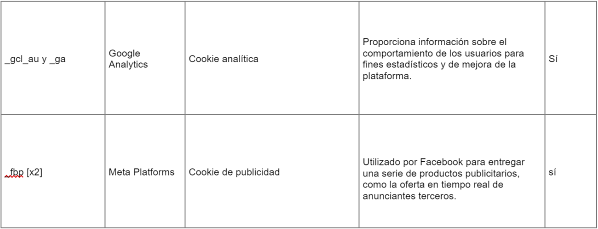 Además de las cookies, tanto nosotros como las empresas mencionadas anteriormente, podemos emplear "píxeles de seguimiento" (también conocidos como web beacons o pixel tags). Estos son pequeñas imágenes transparentes integradas en el propio Marketplace (y, por lo tanto, no almacenadas en tu dispositivo), que nos permiten verificar aspectos como el número de visitantes en una página específica o la configuración técnica del navegador de los usuarios que acceden a ella. Las finalidades para las cuales se utilizan son similares a las descritas en la tabla anterior.